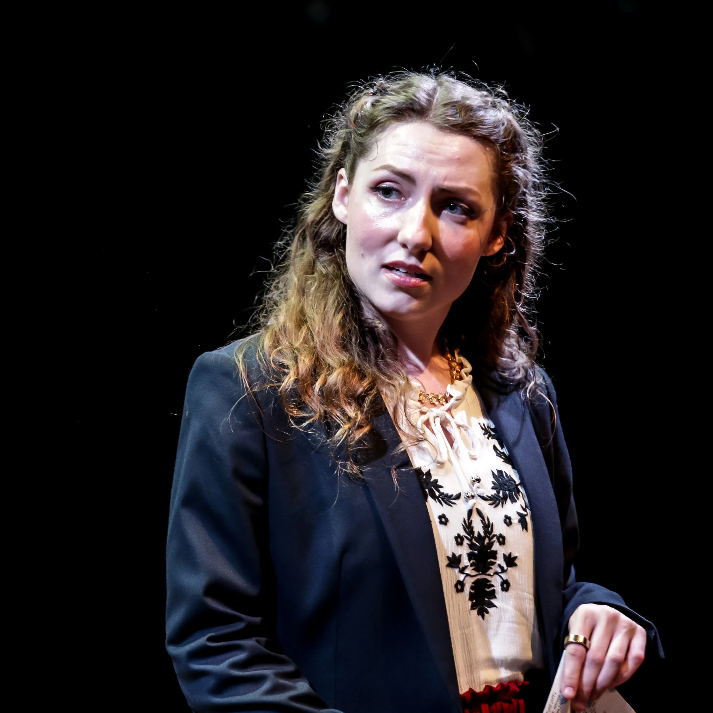 A woman with long curly brown hair, dressed in a black blazer over a embroidered top, standing against a dark background, holding a piece of paper, with a thoughtful expression.