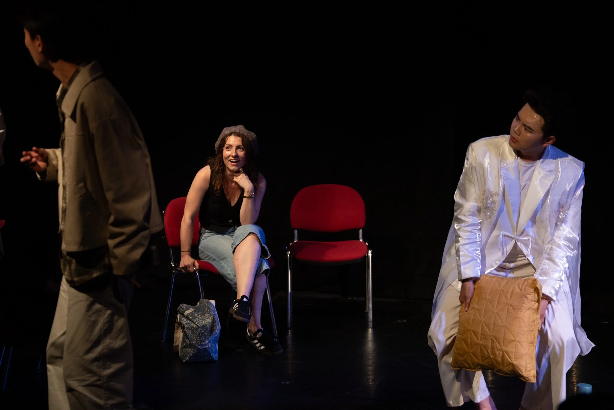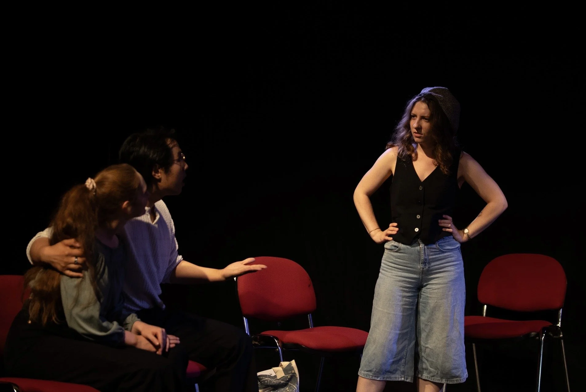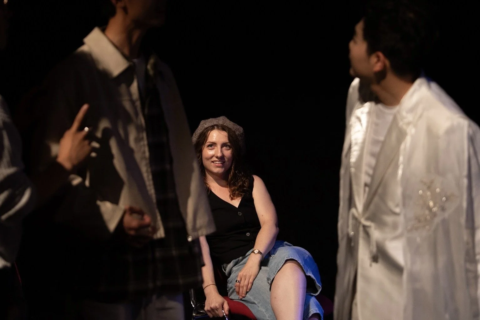 Group of people in a theatrical setting, with a central figure in a black coat facing a person pointing at them. Audience seated in the background.