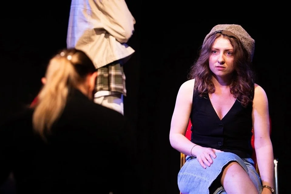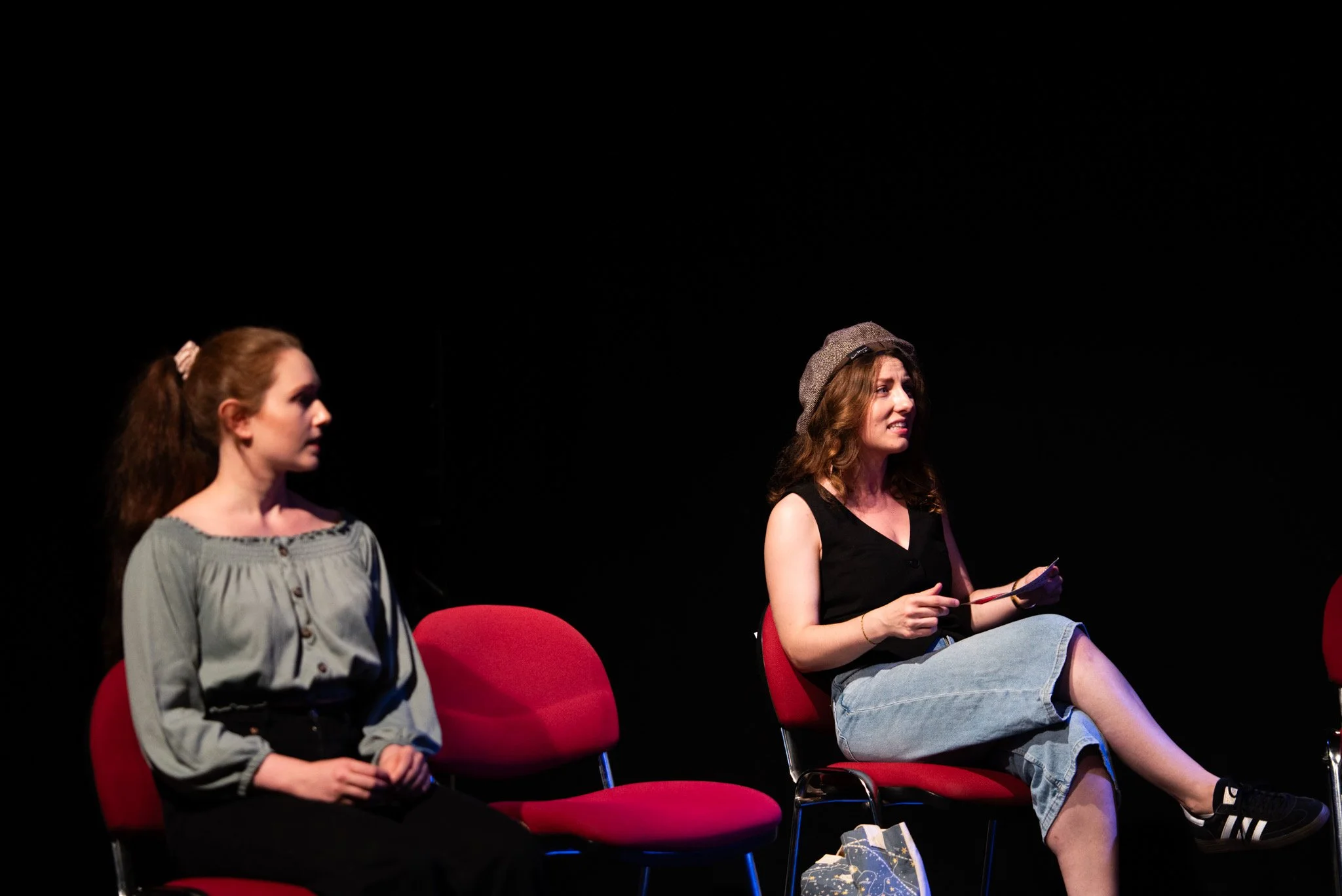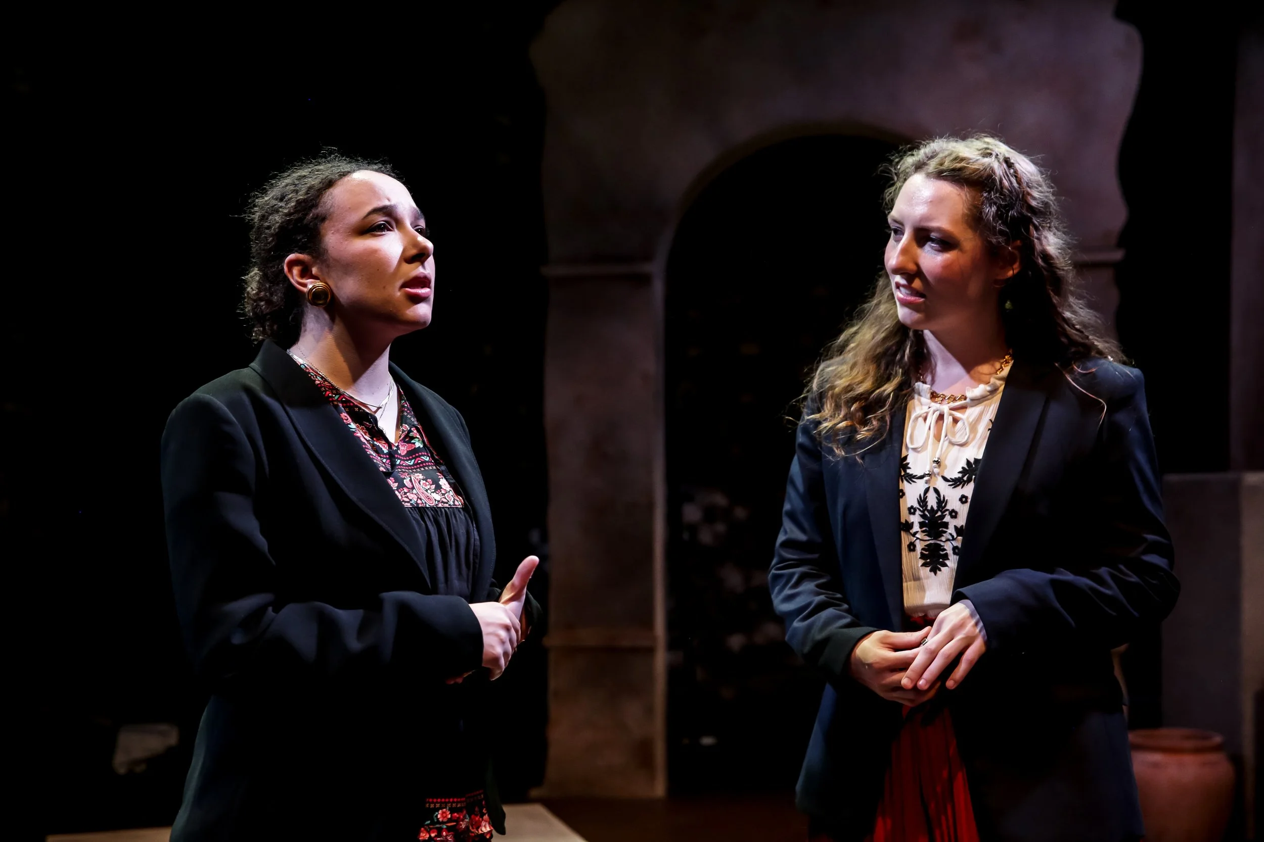Two women having a serious conversation on stage, both wearing black blazers and patterned tops, in a theatrical setting with dim lighting and a dark background.