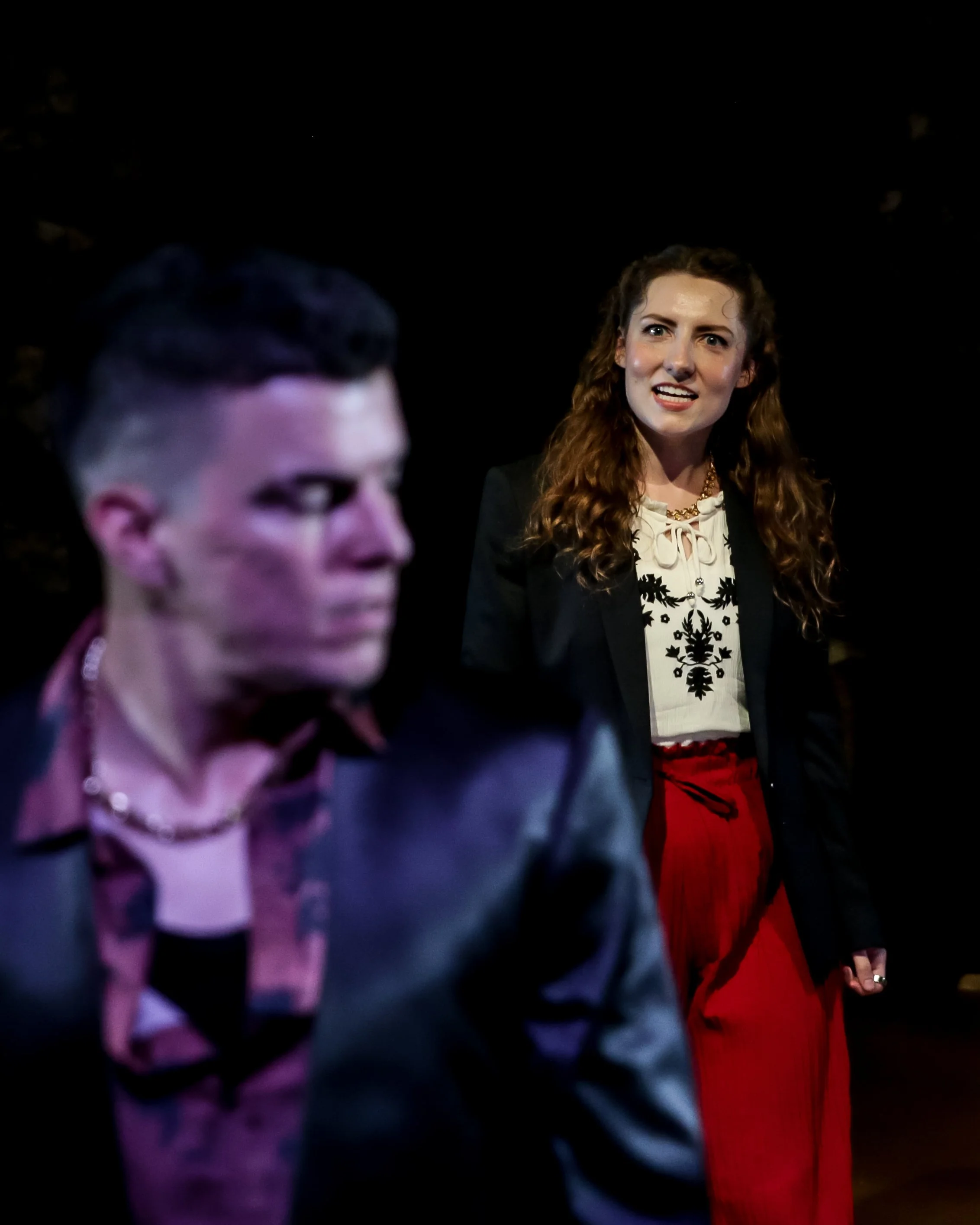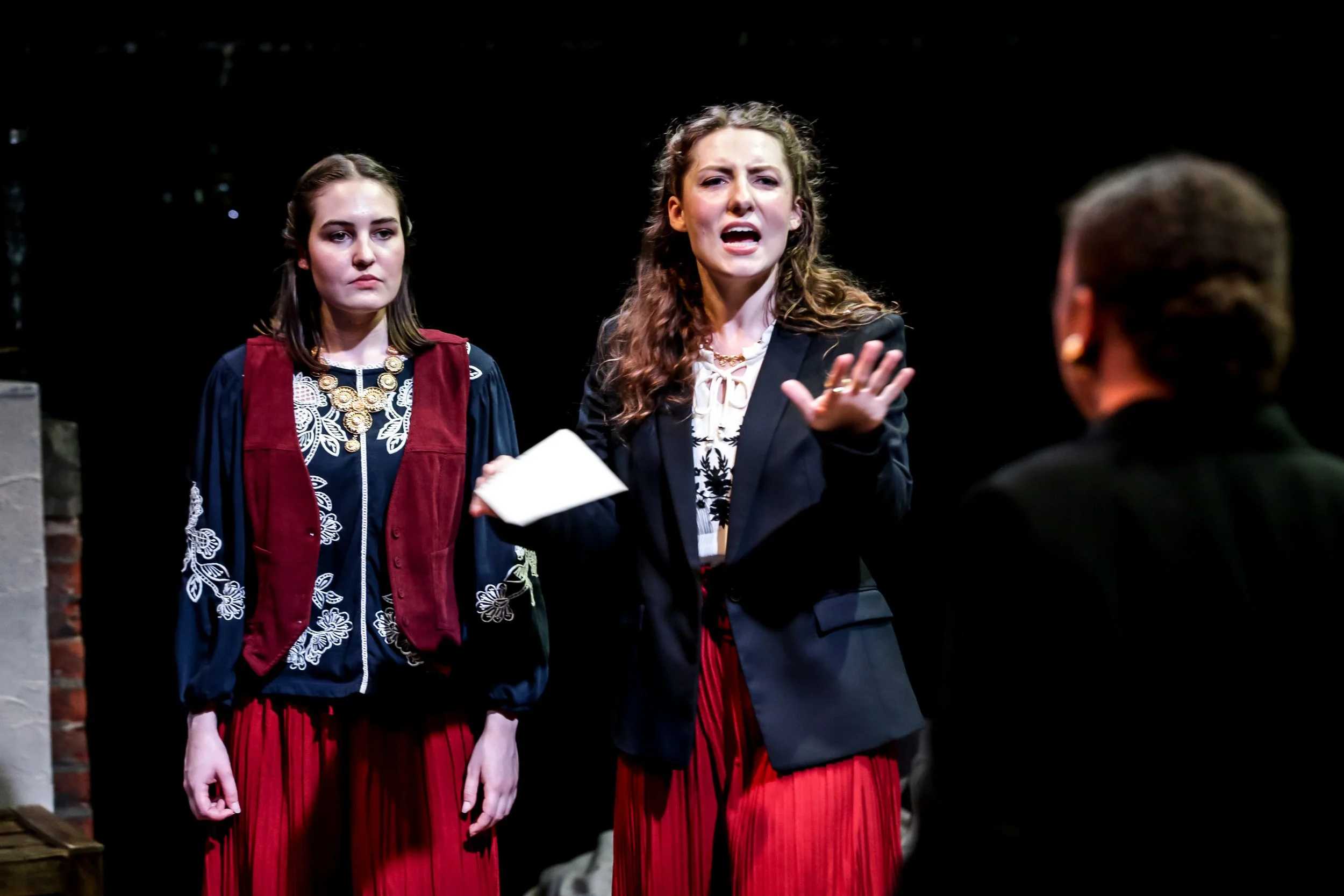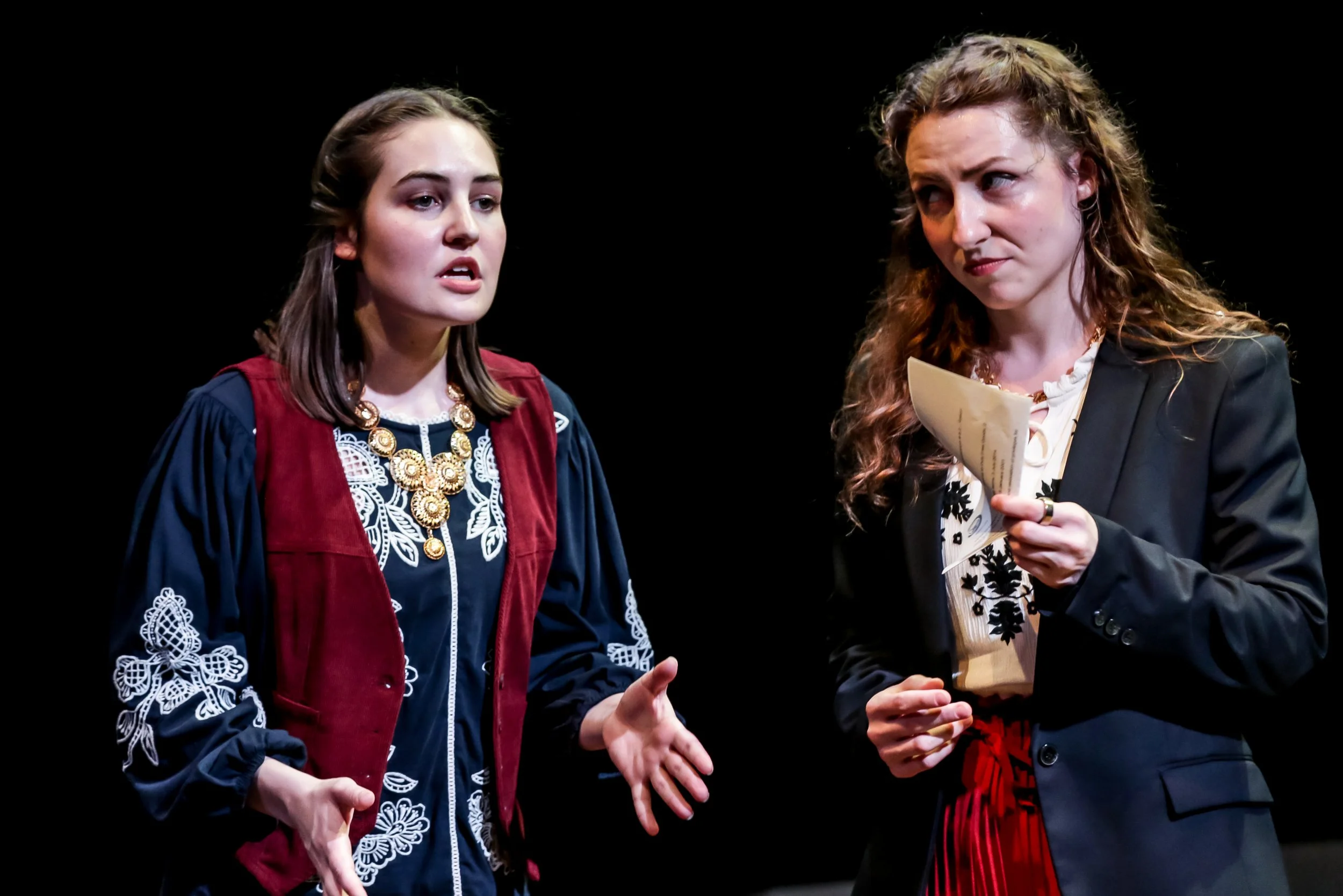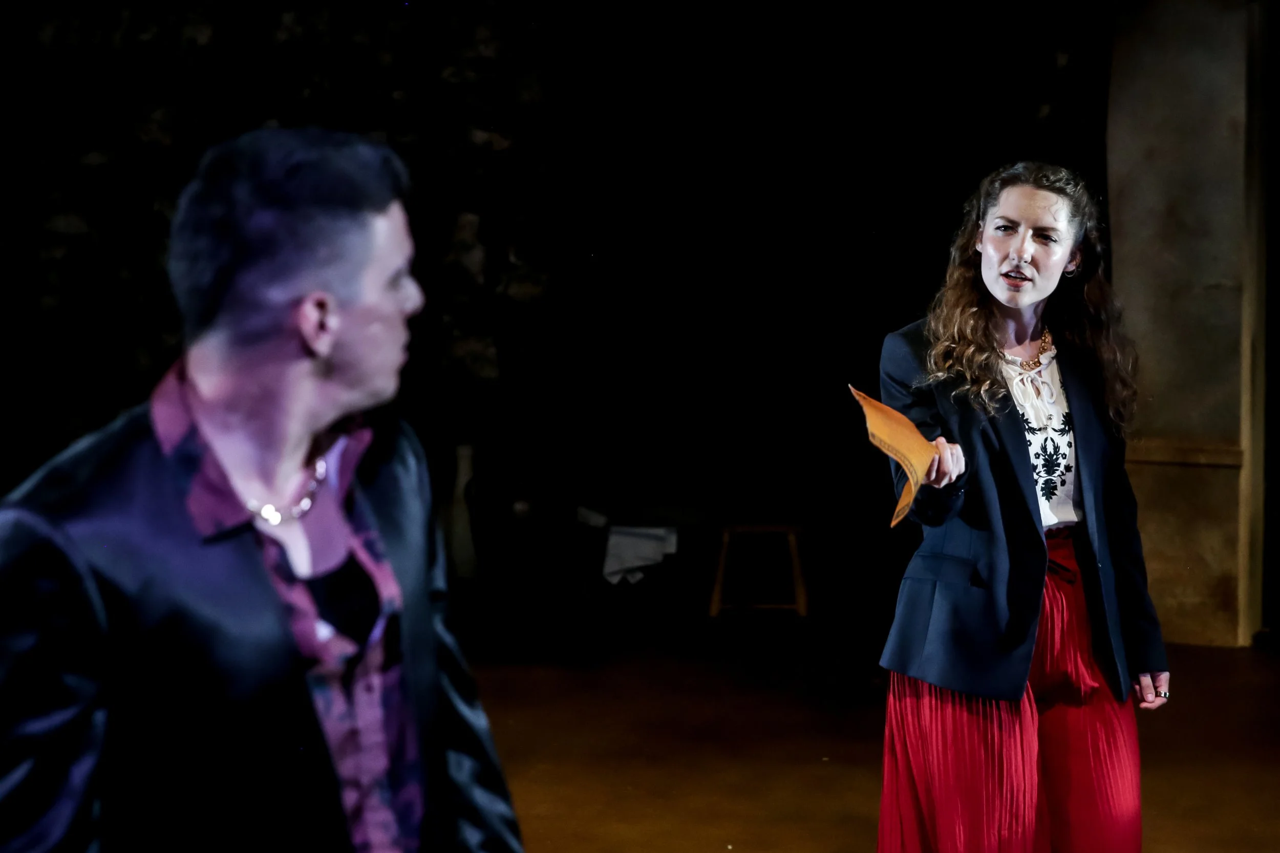 Two actors on stage in a theatrical performance. One woman, with curly hair, wearing a black blazer over a white blouse with black embroidery, red pleated pants, and a necklace, is holding a piece of paper and appears to be speaking or arguing. The m