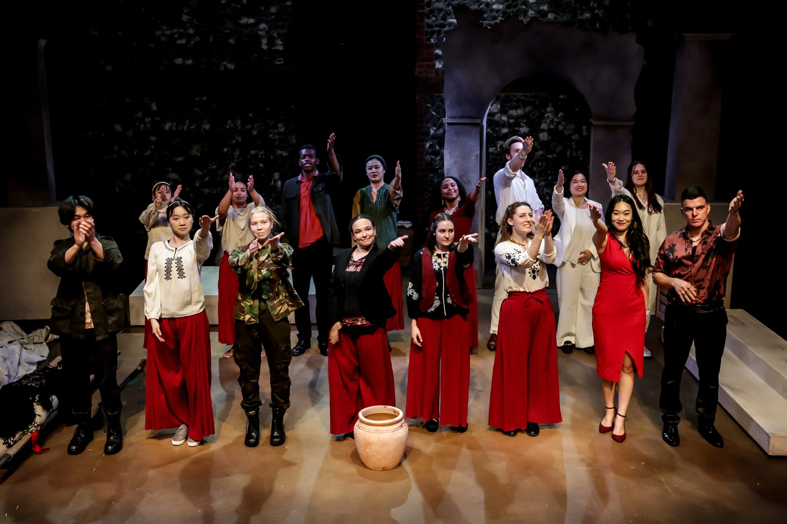 Group of diverse actors on stage, taking a bow after a performance, some wearing traditional outfits and others in contemporary clothing.